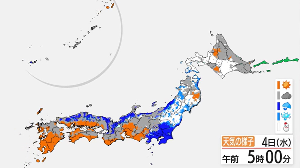 天気 今日の天気 関東は次第に天気回復 北日本では雪続く 太平洋側では大雪のおそれ 2026年3月4日 関東地方は午後から晴れ、気温も上昇する予報ですが、強風により花粉の飛散が増加します。北日本は雪、太平洋側は大雪の恐れも。 関東地方の天気は次第に回復し、午後には晴れ間が広がり、気温も上昇する予報です。しかし、強い風が吹くため、花粉の飛散量が増える可能性があります。花粉症の方は特に注意が必要ですね。 <関連する記事> ... あいえふ