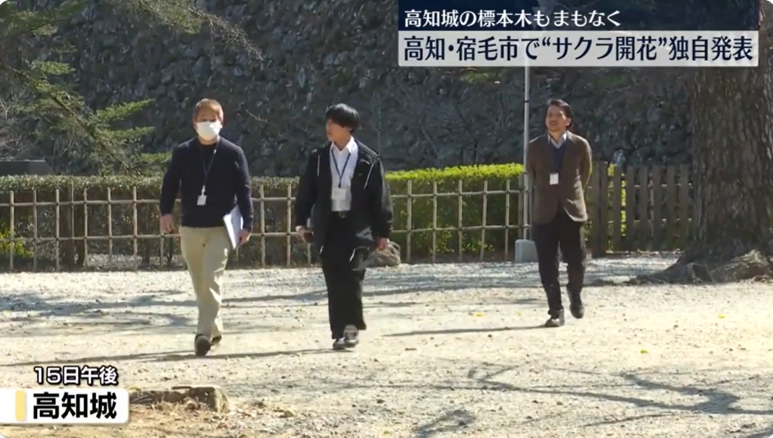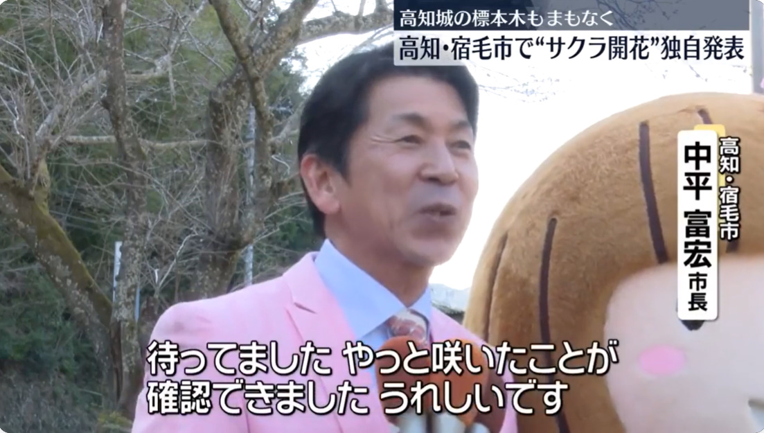 高知県宿毛市にある、市が独自に指定したソメイヨシノの標本木で、15日午後3時に11輪の開花が確認されました。これを受けて、ピンク色の衣装を身にまとった中平富宏市長が独自の開花宣言を行いました。宿毛市では毎年独自に開花発表をしており、今年は昨年より7日早い開花となりました。高知・宿毛市の中平富宏市長は「待ち望んでいました。やっと咲いたことが確認できて嬉しいです」と話しました。一方、高知城の正式なソメイヨシノの標本木には午後、気象台の職員3人が確認に訪れましたが、咲いていたのは3輪で、開花発表には至りませんでした。しかし、16日以降も順調につぼみが膨らむ見込みです。