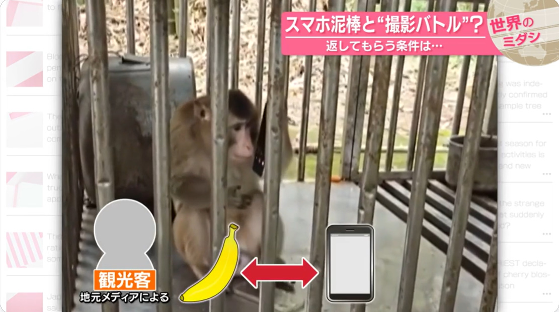 ベトナムで、観光客がサルを撮影しようとした際にスマホを奪われる出来事が発生しました。サルはスマホを操作して遊び、最終的に観光客はバナナ1本と引き換えにスマホを取り戻しました。