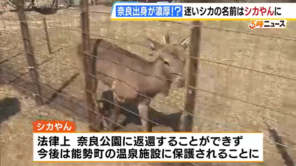 大阪市に迷い込み保護されたシカは「シカやん」と命名され、能勢町の温泉施設で保護されることになりました。人に慣れていることなどから奈良公園由来の可能性が高いですが、法律上戻せないため現地で飼育されています。命名式には大阪府と奈良県の知事が出席し、今後は両府県で連携して対応する方針が示されました。一般公開も検討されています。