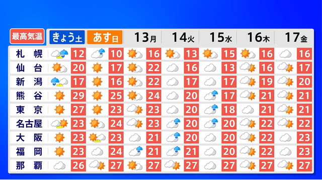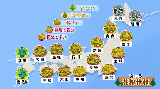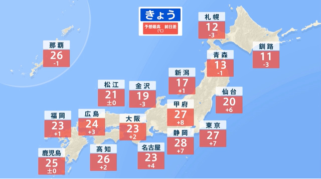 きょうは西日本・東日本を中心に晴れてお出かけ日和となりますが、関東を中心に5月~6月並みの暑さとなり、今年初の夏日が多くの地点で予想されます。湿度は低いものの、暑さに慣れていないため熱中症対策が必要です。また、黄砂やヒノキ花粉が飛びやすく、花粉症の悪化に注意が必要で、紫外線も強まる見込みです。一方、北日本や新潟では雨や雷雨、山沿いでは雪や暴風の荒天となります。あすも本州は晴れて暑さが続きますが、九州では夜に再び雨の見込みです。台風4号は南の海上で発達し、来週は小笠原諸島に影響の可能性があります。