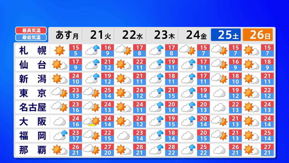 今日は近畿〜北海道で晴れてお出かけ・洗濯日和となる一方、沖縄や九州は雨、中国・四国もにわか雨の可能性があります。気温は広く20℃以上で、名古屋や大阪では夏日となる見込みのため、暑さ対策や水分補給が必要です。今後は20日も晴れますが、21日以降は広範囲で黄砂が飛来する恐れがあり、視界不良や交通への影響に注意が必要です。洗濯は19日か20日のうちに済ませるのがよいでしょう。
