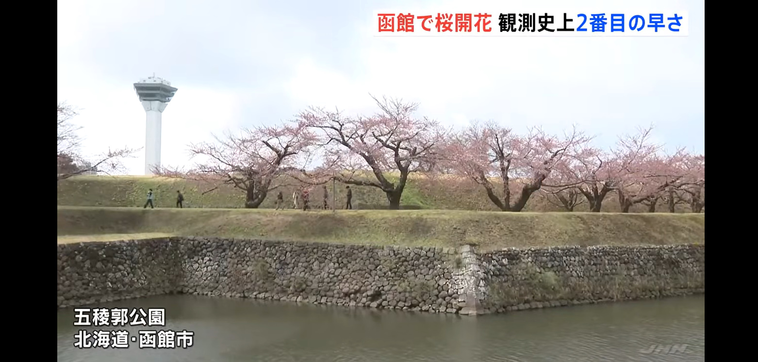 函館地方気象台は五稜郭公園の標本木で5輪以上の開花を確認し、桜の開花を発表しました。平年より10日、昨年より5日早く、観測史上2番目の早さとなりました。