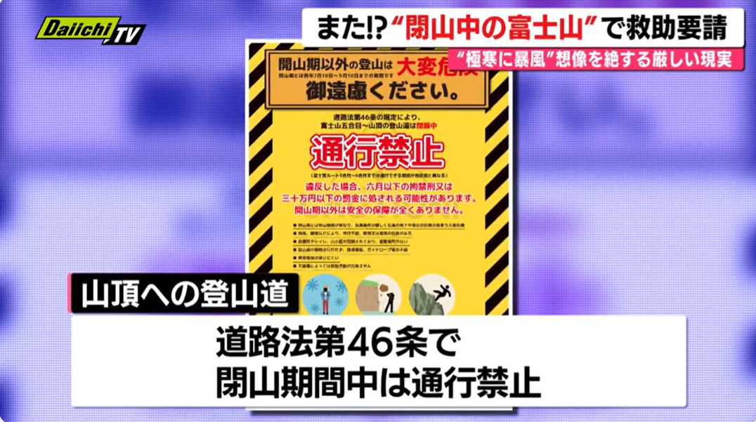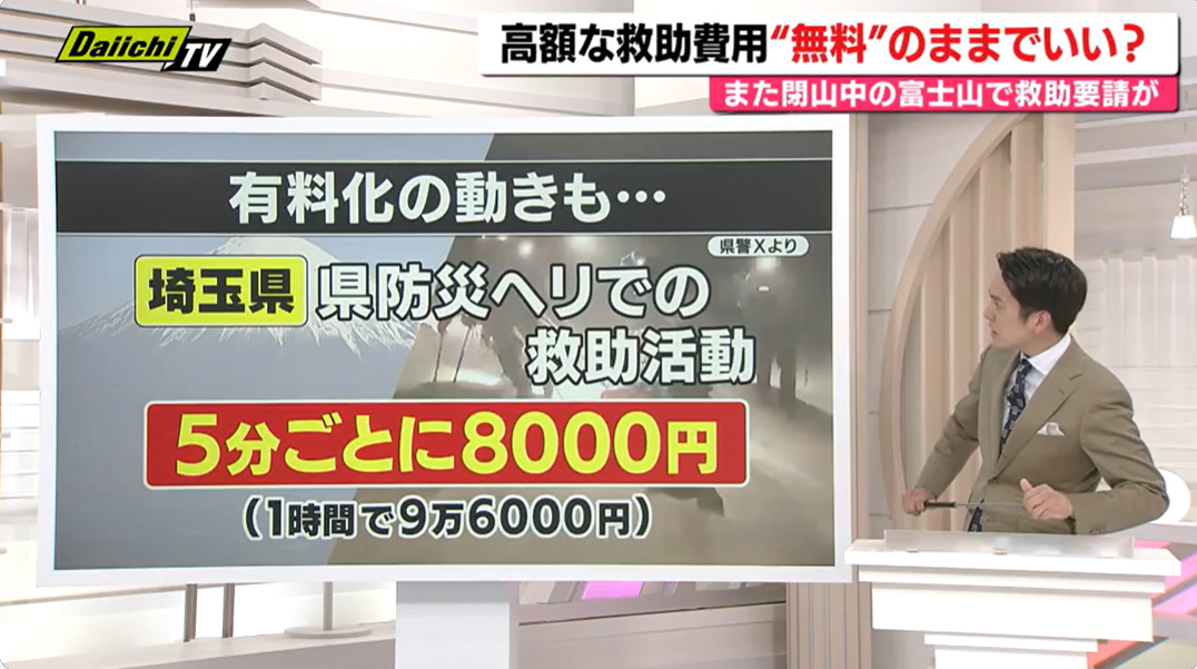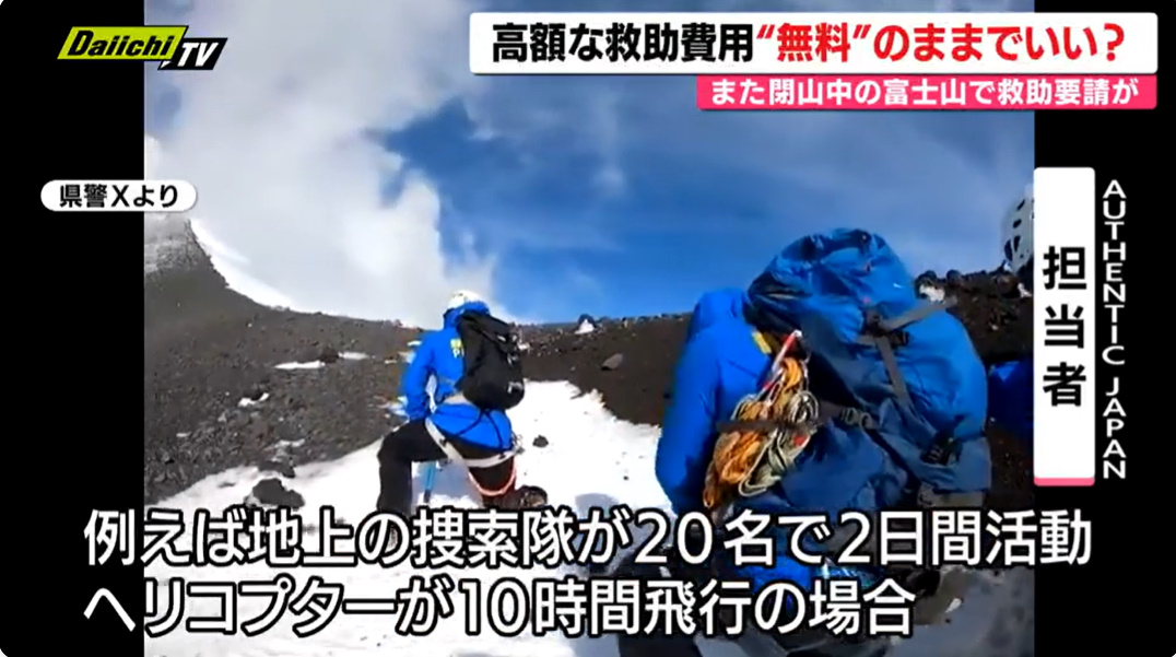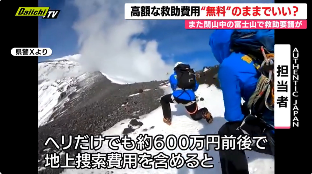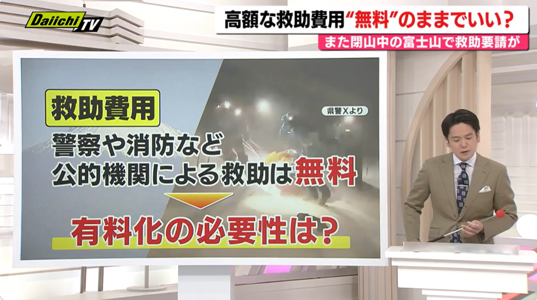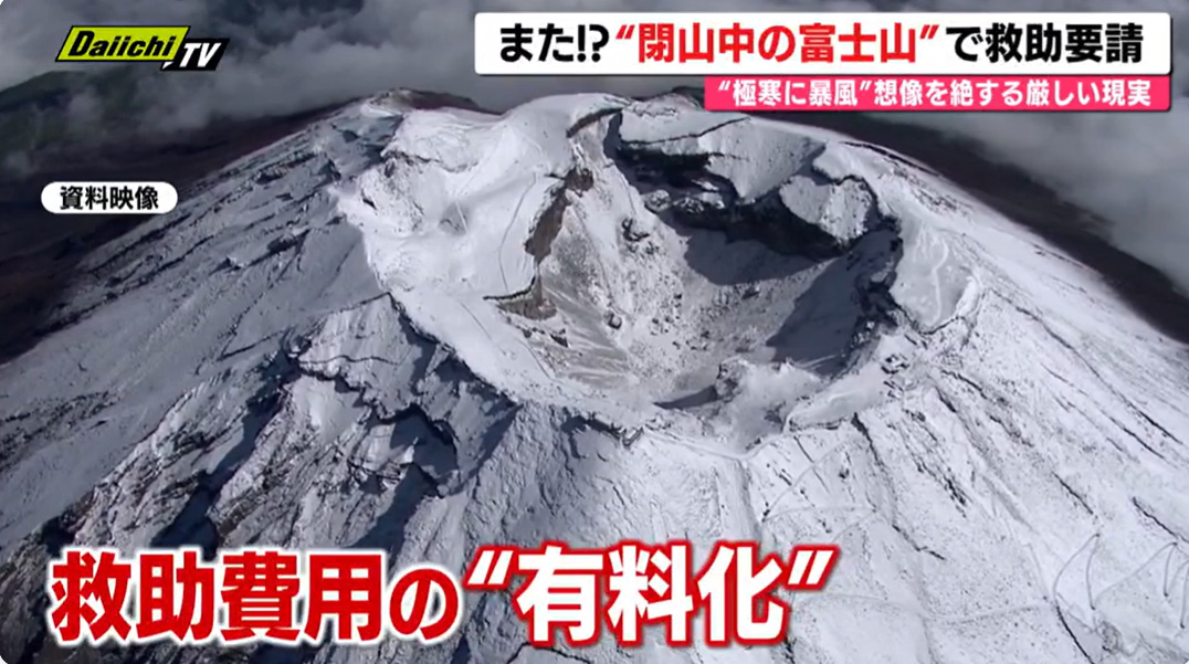 閉山中の富士山で滑落事故が相次ぎ、外国人や日本人登山者の救助が続いています。登山道は通行禁止ですが、それ以外のルートには法的規制がなく、危険な登山が後を絶ちません。冬〜春の富士山は天候が急変し、氷点下や吹雪になるなど非常に危険で、救助も困難です。ヘリが使えない場合もあり、救助隊は命がけで対応しています。救助費用は現在、公的機関によるものは税金で賄われていますが、1回の捜索で数百万円規模になることもあり、有料化や自己負担を求める議論が進んでいます。一方で、有料化により救助要請をためらう懸念も指摘されています。事故を防ぐには、危険性の周知やルール整備、多言語での注意喚起などが必要とされています。