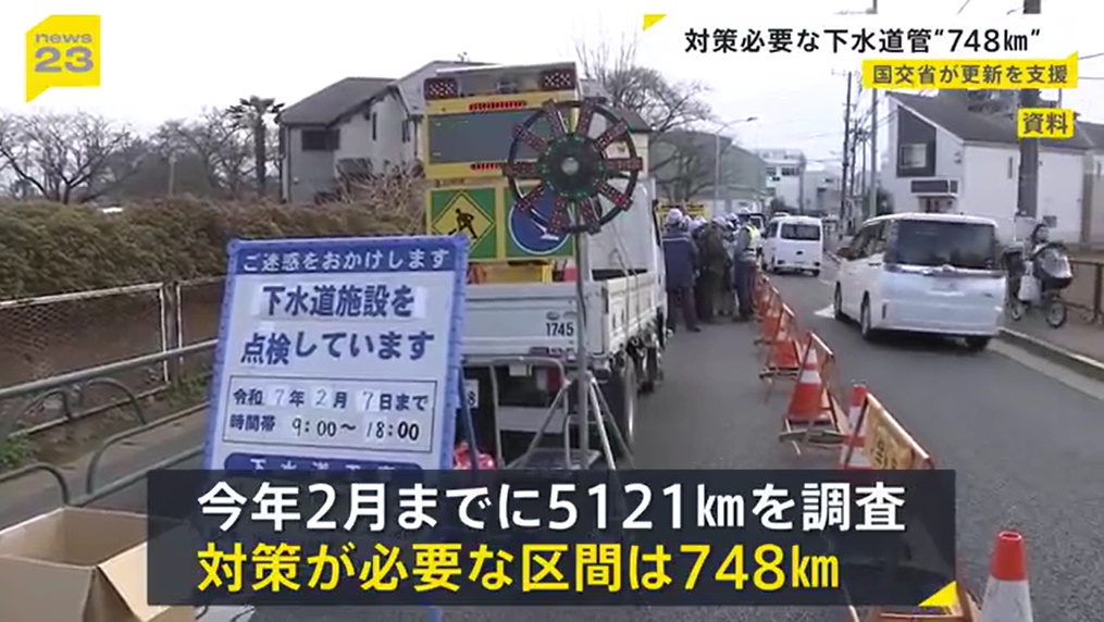埼玉県八潮市の道路陥没事故を受け、国土交通省が老朽化した下水道管(直径2m以上・30年以上経過)の調査を全国に要請しました。約5121kmの調査の結果、748kmで対策が必要と判明し、国は自治体に早急な更新を求めるとともに支援を行う方針です。