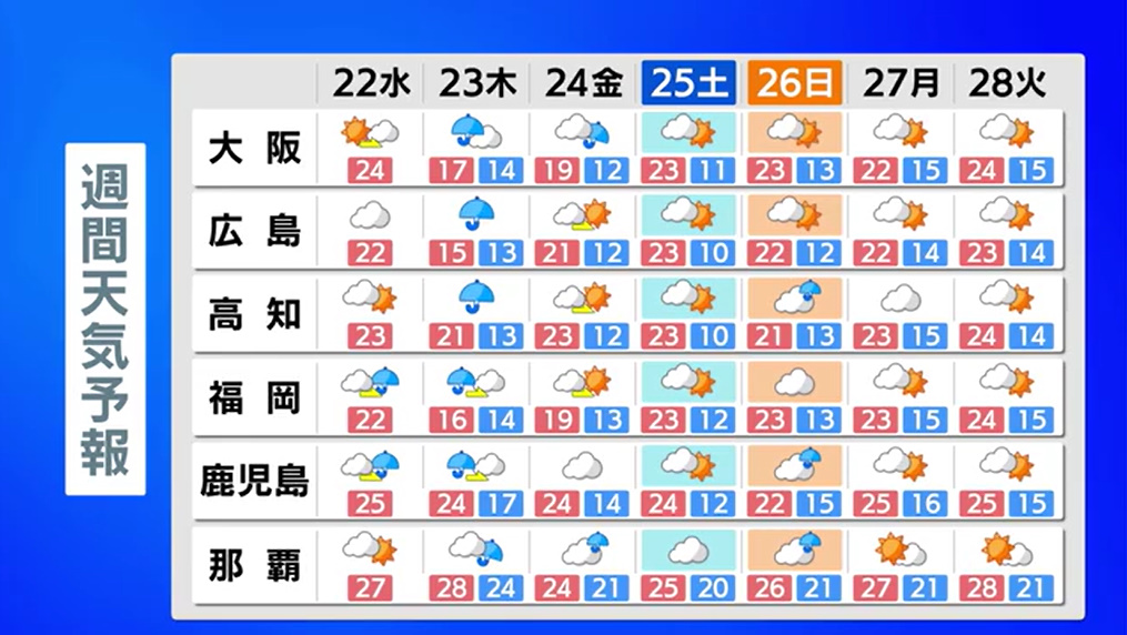 きょう22日(水)は西~東日本で午前を中心に晴れるますが、広く黄砂が飛来します。九州は昼過ぎから雨、夜は本降りになります。北日本は大気不安定で急な雷雨や突風に注意が必要です。最高気温は西日本でやや低下、東北では上昇し、概ね22℃前後です。あす23日(木)は西~東日本で雨と風が強まり、激しい雨や大雨の恐れがあります。