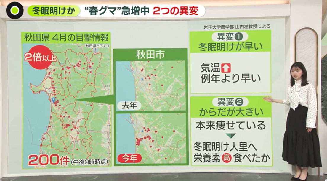 冬眠明けのクマ(春グマ)の目撃が各地で急増し、専門家が“異常事態”と指摘しています。岩手県では警察官が襲われ負傷し、近くで女性の遺体も発見されました。冬眠明けのクマは空腹で興奮状態にあり、例年より出没が多いです。背景には、気温上昇で目覚めが早いことや、人里で食べ物を得て体が大きい個体が増えていることがあります。さらにハンター不足も対応を難しくしています。市街地でも出没が相次ぎ、仙台市では住宅街で緊急駆除が実施されたほか、東北や関東各地でも目撃が増加しており、警戒が強まっています。
