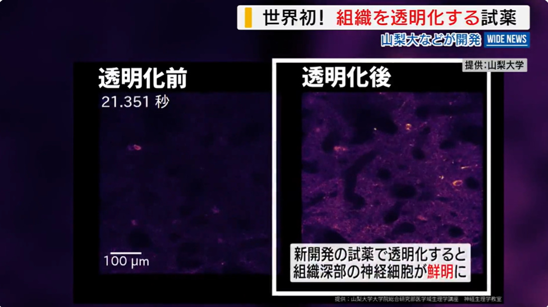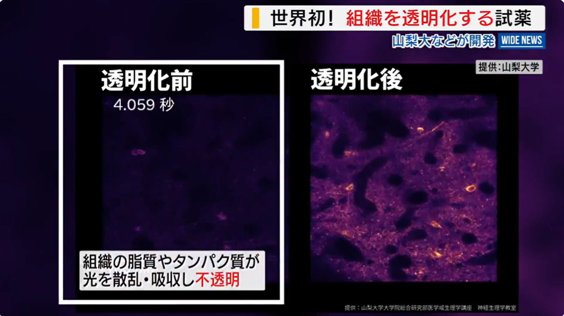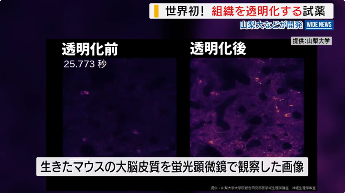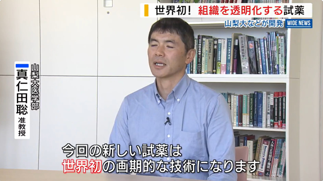 トピック 新技術 社会 透明人間になれる?? 試薬で哺乳類の組織を透明化??山梨大など研究グループ⁉ 2026年4月27日 2026年4月27日 あいえふ Twitter Pocket 山梨大学などの研究グループは、生きたまま哺乳類の脳組織などを透明化できる世界初の試薬を開発しました。アルブミンを活用することで毒性を抑え、深部の神経細胞を鮮明に観察できるのが特徴です。脳の働きや病気の研究に役立ち、将来的には霊長類への応用も期待されています。 <関連する記事> 世界初!生きたまま“組織を透明化する”試薬 山梨大などが開発 透明人間は可能?(2026年4月9日掲載)|YBS NEWS NNN - 日テレNEWS NNN (出典:日テレNEWS NNN) <関連する画像> (出典:https://news.ntv.co.jp/) <関連する動画> 【開発】透明人間も!? 試薬で哺乳類の組織を透明化 山梨大など研究グループ NNNセレクション (出典 Youtube) <X(旧ツイッター)の反応> ミッチ @mituchi5 【開発】透明人間も!? 試薬で哺乳類の組織を透明化 山梨大など研究グループ NNNセレクション youtu.be/Yy6MDQcxU-g?si… @YouTubeより (出典 @mituchi5) ザッツ雑学ニュース @thats_zatugaku 【開発】透明人間も!? 試薬で哺乳類の組織を透明化 山梨大など研究グループ NNNセレクション youtube.com/watch?v=Yy6MDQ… (出典 @thats_zatugaku) ピックアップ記事 Facebook Twitter
