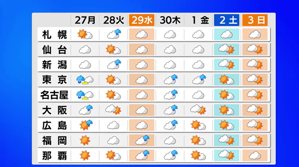 東日本や東北南部は雨が降りやすく、特に関東や東海では昼頃まで強い雨や雷雨に注意が必要です。西日本は天気が回復して日差しが届くが、にわか雨の可能性あります。東北北部や北海道は雲が多いものの気温は高めで、寒暖差に注意が必要です。